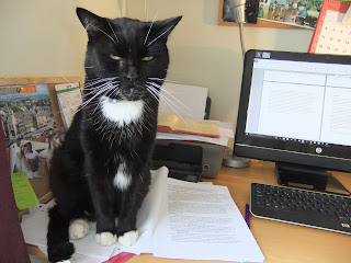 I write at the computer in our front room, which serves as my study. Both Pip and Nancy have been known to wander in and drape themselves across my keyboard, or settle down for a lengthy wash on the print-out of my chapter plan. Sometimes it feels like they’re taunting me when they nap on top of my work – especially if I’m writing very early in the morning or late at night and am exhausted. It would be fair to say I have a certain amount of envy at their leisurely lifestyles, and their ability to take a nap whenever they fancy it.